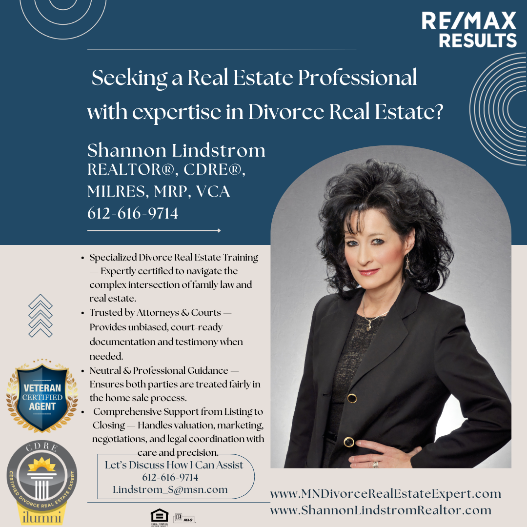 If you’re going through a divorce in Minneapolis, St. Paul, or the surrounding Twin Cities area, and need assistance with a home sale, valuation, or buyout, Shannon Lindstrom, Certified Divorce Real Estate Expert (CDRE®), is here to help.